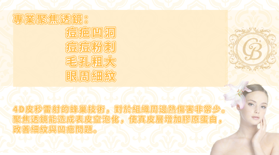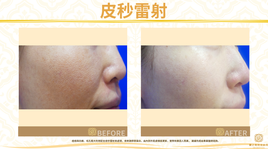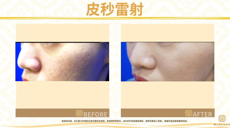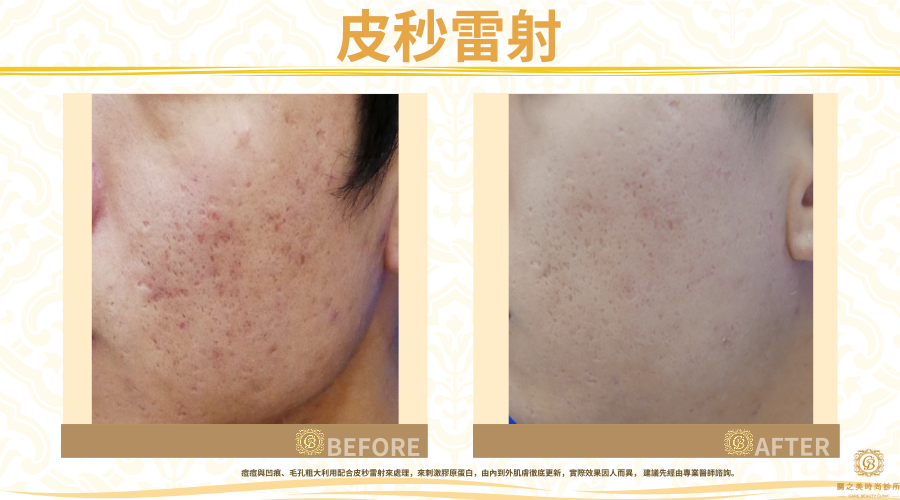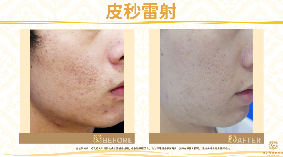 痘痘與凹痕、毛孔粗大利用配合皮秒雷射來處理,來刺激膠原蛋白,由內到外肌膚徹底更新,實際效果因人而異, 建議先經由專業醫師諮詢。