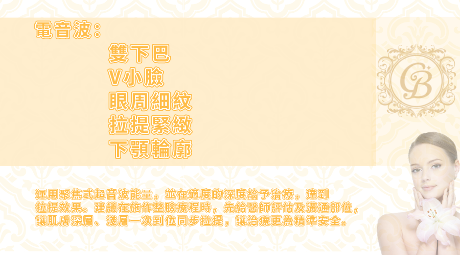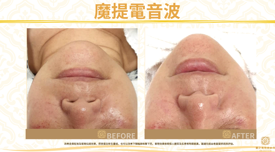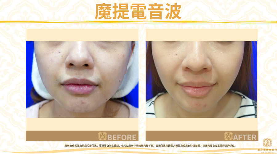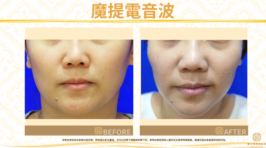 改善皮膚鬆弛及緊緻拉提效果,膠原蛋白新生重組,也可以改善下顎輪廓和雙下巴。實際效果依照個人體質及反應有時間差異,建議先經由專業醫師諮詢評估。