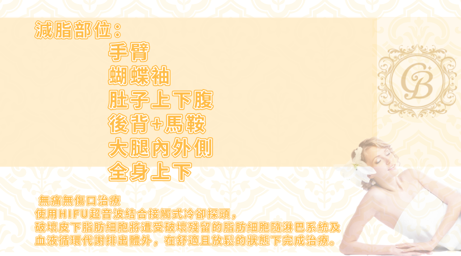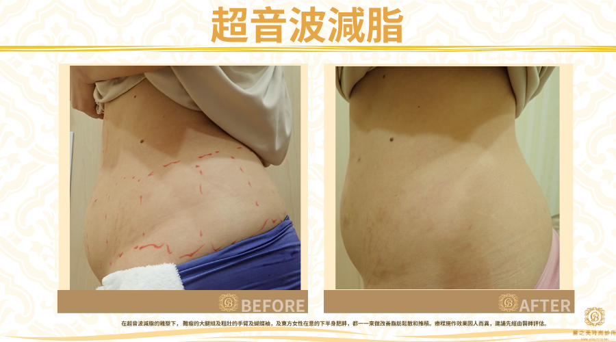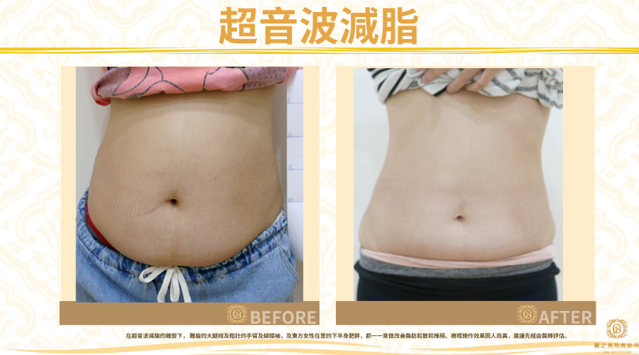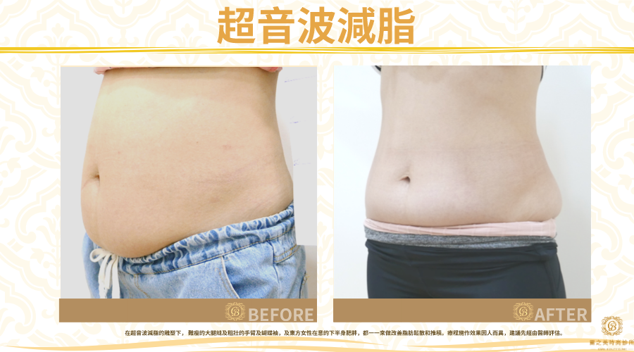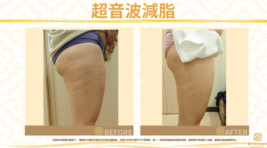 在超音波減脂的雕塑下, 難瘦的大腿縫及粗壯的手臂及蝴蝶袖,及東方女性在意的下半身肥胖,都一一來做改善脂肪鬆散和推積。療程施作效果因人而異,建議先經由醫師評估。