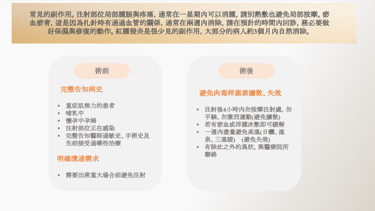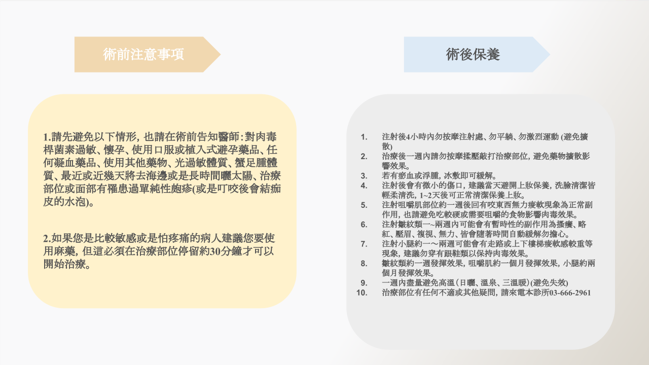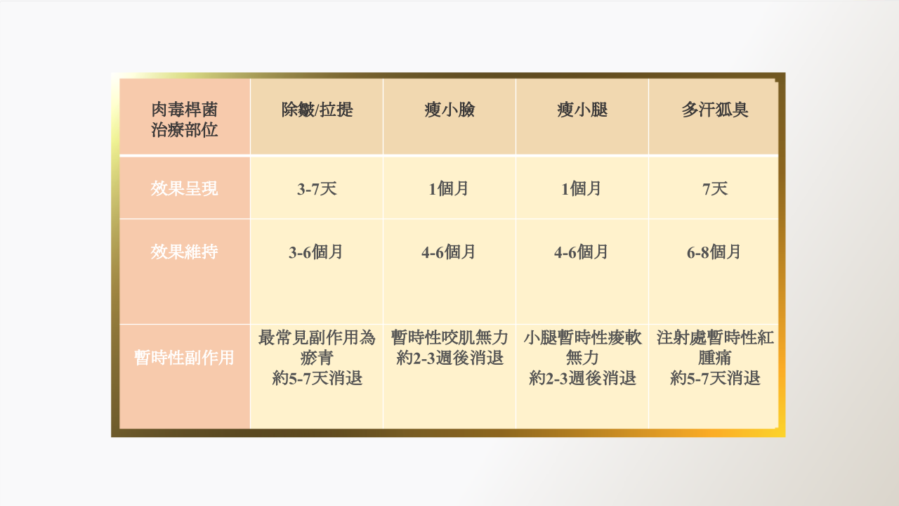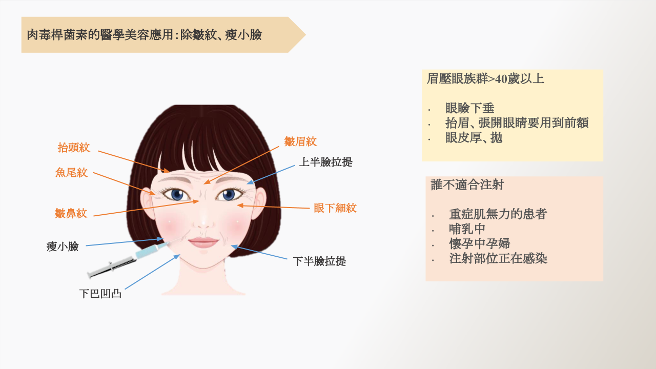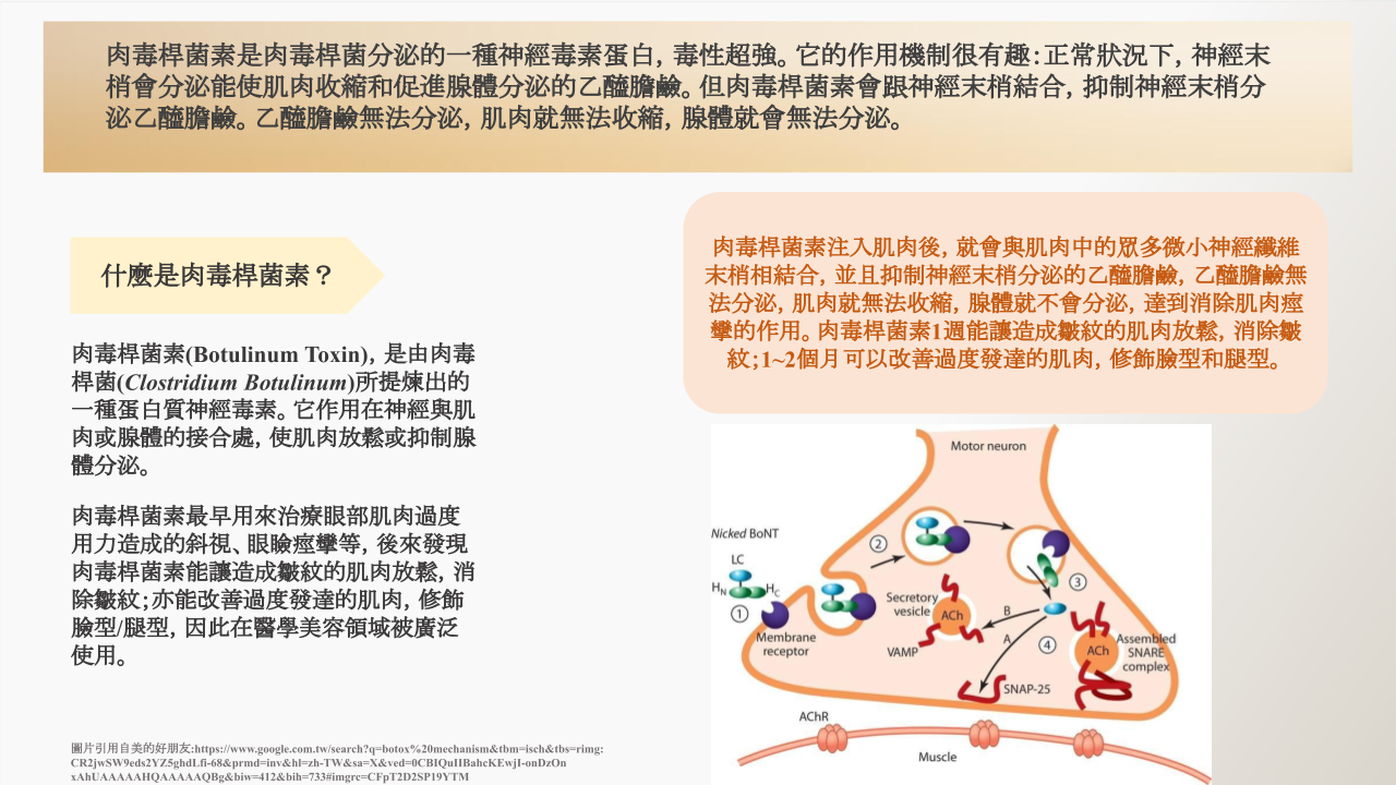 一般來說,人體的神經末梢會分泌促進肌肉收縮的乙醯膽鹼。 當注射了肉毒桿菌,肉毒桿菌會跟神經末梢結合,抑制神經末梢分泌乙醯膽鹼,這樣一來肌肉就無法收縮,便可達成抑制咀嚼肌/瘦臉、抑制小腿肌過度發達、抑制腋下汗腺過度排汗/消除狐臭、或是麻痺鬆弛的皮下神經達成除皺的效果。 目前台灣經衛生署核准的A型肉毒桿菌毒素共有三種:Dysport、Xeomin、BOTOX,各有不同特點,適合哪種肉毒桿菌素,仍需針對不同部位及適應症,依照專業醫師的判斷和技術,才能獲得理想的治療成果。